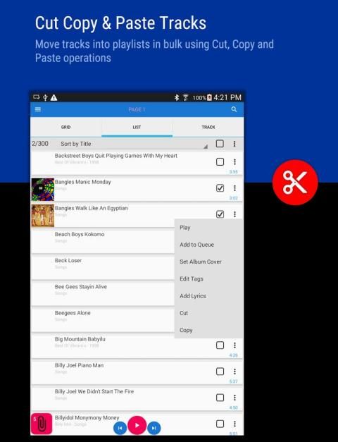 : Move songs into playlists while music is playing. With a single click, move currently playing song into another playlist. Next song is started immediately, so you can keep moving songs rapidly.