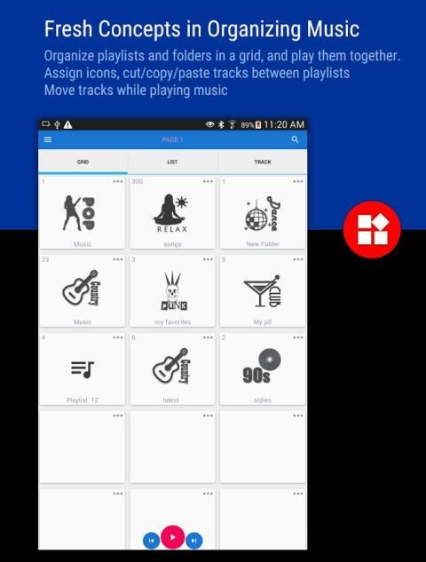 This music organizer player has a great way of managing music library. The folders and playlists, both are neatly arranged on a grid. You can set icons to each cell on the grid, move tracks around the grid from playlist to another with simple cut/copy/paste operations. The beauty with this MP3 player is that you can select any number of playlists and play them together, creating many different mixes. Different types of music genre can be placed in different pages, so picking right music for right occasion or mood is a breeze.