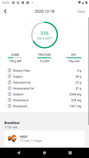 • पूर्ण पोषण मैक्रो ट्रैकर और कैलोरी काउंटर - विस्तृत दैनिक पोषण विश्लेषण। कैलोरी की गणना करें और आपके द्वारा खाए गए खाद्य पदार्थों का पूरा विवरण देखें - कैलोरी, कार्बोस, वसा, प्रोटीन से आहार फाइबर, शर्करा, संतृप्त / असंतृप्त वसा, सोडियम, कोलेस्ट्रॉल और पोटेशियम से।