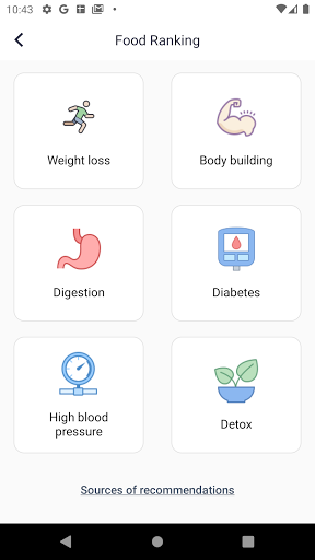 • खाद्य रैंकिंग - खाद्य पदार्थों की जांच करें जो आपके लक्ष्यों को प्राप्त करने में मदद करते हैं या खाद्य प्रतिबंधों को समायोजित करते हैं, जैसे वजन घटाने, शरीर की इमारत, पाचन, मधुमेह, उच्च रक्तचाप, डिटॉक्स।