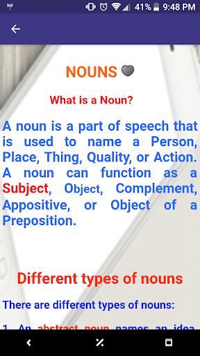 जानें अंग्रेजी व्याकरण कभी इस आसान सीखने ऐप के साथ आसान और आसान नहीं था। कोई फर्क नहीं पड़ता कि आप एक शुरुआती अंग्रेज़ी सीखने वाले या एक उन्नत शिक्षार्थी कुछ कठिन अंग्रेजी परीक्षा के साथ-साथ प्रतिस्पर्धी परीक्षाओं और पाठ्यक्रम परीक्षाओं के लिए तैयार हैं, हमने आपको कवर किया है। यह ऑफ़लाइन अंग्रेज़ी सीखने ऐप में अंग्रेज़ी व्याकरण के प्रत्येक पहलू में, संज्ञा, विशेषण, और क्रियाविशेष से गेरुंड, स्पर्श और सहायक क्रियाओं के लिए शामिल किया गया है। आपको एक-एक करके सबक का पालन करने की आवश्यकता है, व्याकरण के नियमों को सीखना, अभ्यास करना और अभ्यास करना, यह सुनिश्चित करने के लिए कि आपने पूरे अंग्रेजी व्याकरण में महारत हासिल की है।