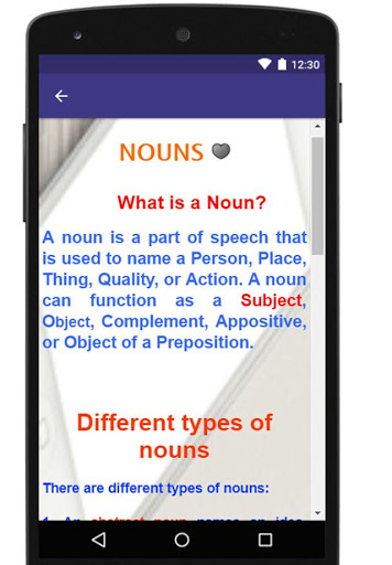 जानें अंग्रेजी व्याकरण एक स्वच्छ और स्वच्छ डिजाइन के साथ आता है और इंटरफ़ेस बहुत उपयोगकर्ता के अनुकूल है और अंग्रेजी पाठ का पालन करना इतना आसान है, ताकि आप विभिन्न पाठों और विषयों के माध्यम से ब्राउज़ करने के बाद पूरे विचार प्राप्त कर सकें। अगर आपको लगता है कि आप उन्नत अंग्रेज़ी सीखने वाले हैं, तो आप आसानी से आसान सबक छोड़ सकते हैं और अधिक कठिन व्याकरण चुनौतियों पर ध्यान केंद्रित कर सकते हैं।