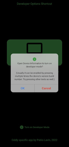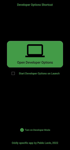 This app allows you to launch the developer options of your device from a fast shortcut. Having the developer mode enabled is required for the shortcut to work.