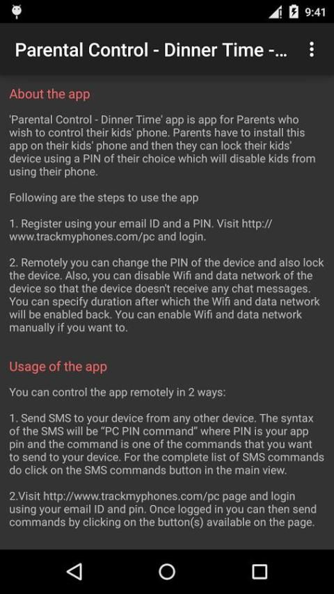 आप (हमारी वेबसाइट से या एसएमएस का उपयोग करके) दूर से डिवाइस का पिन बदलने के लिए और भी वाईफ़ाई और मोबाइल का उपयोग नहीं करने के लिए अपने बच्चों के लिए मजबूर कर देगी जो डाटा नेटवर्क, अक्षम कर सकते हैं इस एप्लिकेशन का उपयोग करना। तुम तो आप अपने बच्चों को उनके मोबाइल का उपयोग शुरू करना चाहते हैं एक बार पहले नंबर करने के लिए वापस पिन बदल सकते हैं।
