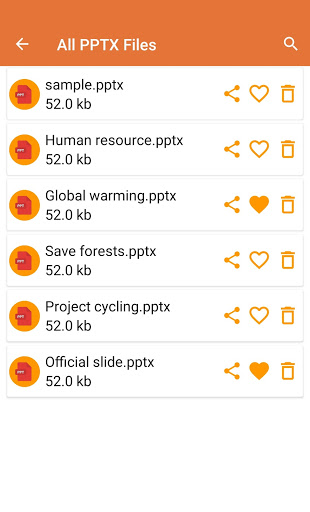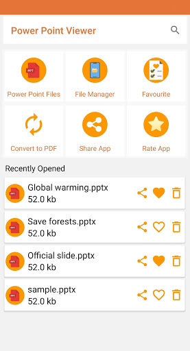 पीपीटीएक्स व्यूअर: स्लाइड्स ओपनर और पीपीटी रीडर ऐप एक ही स्थान के दौरान आपके डिवाइस में सभी पीपीटी फाइलों को सूचीबद्ध करता है ताकि आप आसानी से इसके माध्यम से स्क्रॉल कर सकें। फ़ाइल व्यूअर आपके डिवाइस पर प्रस्तुति फ़ाइलों को देखने के लिए एक आसान और तेज़ टूल हो सकता है। आप अपनी सभी पीपीटी / पीपीटी फाइलों को एक ही स्थान पर झटका देते हैं। पीपीटीएक्स फ़ाइल ओपनर पावरपॉइंट: पीपीटी फ़ाइल रीडर और फ़ाइल व्यूअर फ़ोल्डर संरचना दृश्य में सभी फ़ाइलों को प्रबंधित और व्यवस्थित करने में सहायता करता है। फ़ाइल व्यूअर आपको एंड्रॉइड पर दस्तावेज़ को प्रबंधित और विचार करने की अनुमति देता है। चलते समय अपने अंतिम उपयोग किए गए पीपीटी डाउनलोड को जल्दी से डाउनलोड करने के लिए मिला? स्लाइड डेक किसी भी डिवाइस पर सीधी पहुंच के लिए अपनी हाल की फ़ाइलों का एक तेज़ दृश्य।