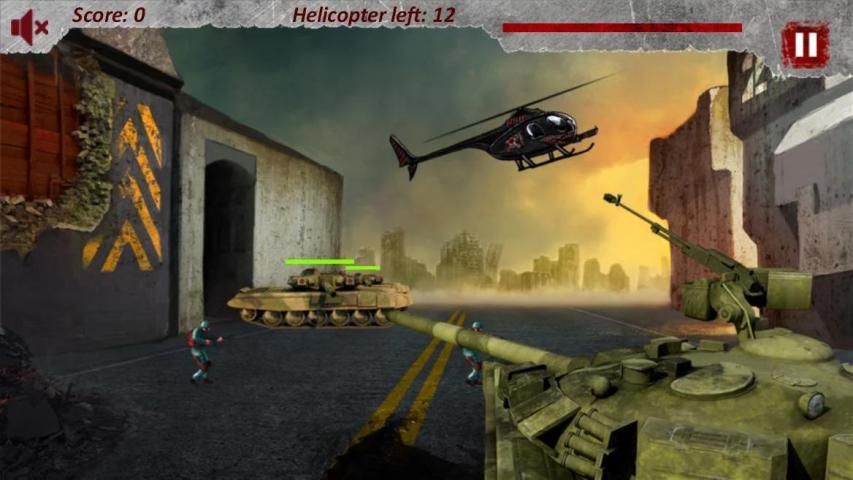 There are three types of enemies. Tanks, men and choppers. First two are coming from left to right, and shoot faster and faster as game level up. Choppers don’t shoot. They are heading to their base and calling more enemies. If twelve choppers pass on right side, game is over. There are two weapons. Cannon and submachine gun. Cannon is for enemies on the ground, and submachine gun for choppers. They switch automatically when player aim. Tap on enemies to shoot them.