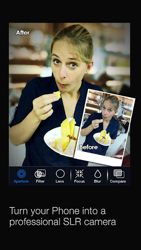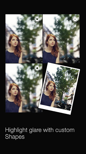 बड़े लेंस में एपर्चर समायोजित करें एक ही इशारे के साथ तुरंत फोकस क्षेत्र के धुंध स्तर को बदलने के लिए। बड़े एपर्चर पृष्ठभूमि को और अधिक धुंधला करते हैं! 9 अद्वितीय लेंस प्रदान करता है जो दिल और सितारों (बोके प्रभाव) जैसे आकारों में धुंधला करने के लिए फोकस प्रकाश बिंदुओं को बाहर निकालने की अनुमति देते हैं। यह महान उपकरण वायुमंडलीय पृष्ठभूमि में सरल दिखने वाली पृष्ठभूमि बदल जाता है।