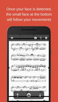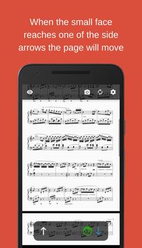 For that magic to happen you only need to place your device on a music stand and stay in front of it, letting the front camera detect your face. Once that happens, you'll see a small face following your head movements. Move your head to the side while looking at the screen until the small face reaches one of the side indicators. Then the page will move. Tilt a bit your body to the side if necessary.