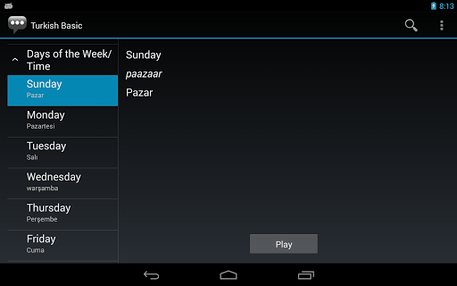 3। वाक्यांश विवरण पृष्ठ पर, तुर्की वाक्यांश अपने उच्चारण और समकक्ष अंग्रेजी वाक्यांश के साथ दिखाया गया है। एक देशी स्पीकर द्वारा ऑडियो उच्चारण सुनने के लिए प्ले बटन दबाएं।