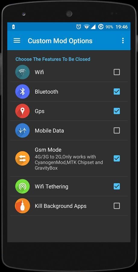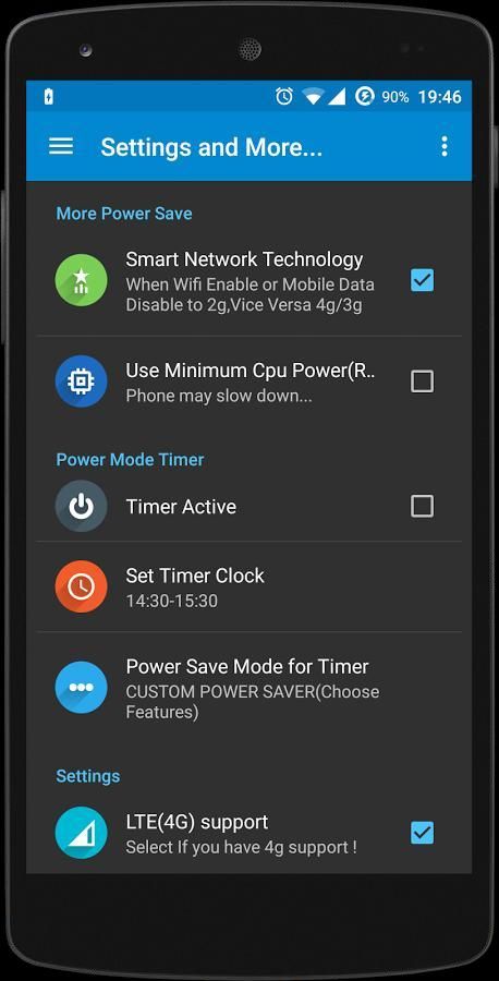 Application has 3 mode - Soft Power Saver(Wifi,Mobile Data,Bluetooth) - Hard Power Saver(All Features) - Custom Power Saver(Choose features from custom mode options)
