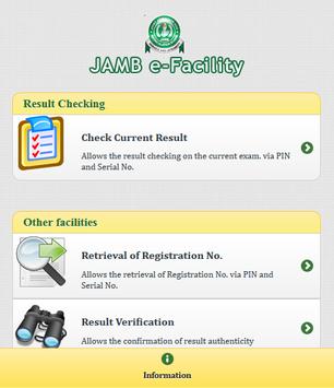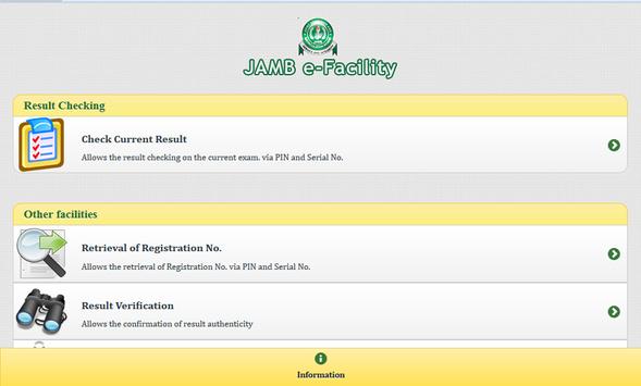 JAMB e-Facility is an intuitive, secure and friendly application to perform the core operational services needed by Joint Admissions and Matriculation Board candidates as well as the other individuals that require such services.