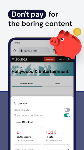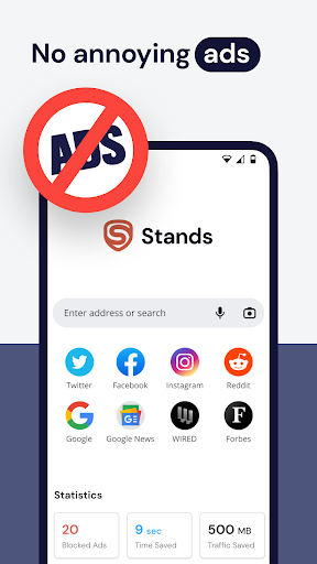 Stands AdBlocker Browser is an ad-free browser that efficiently eliminates various types of ads, including annoying banners, intrusive pop-ups, and harmful malware. Our app goes beyond ad blocking to ensure comprehensive protection against security threats while safeguarding users' online privacy from pervasive tracking.