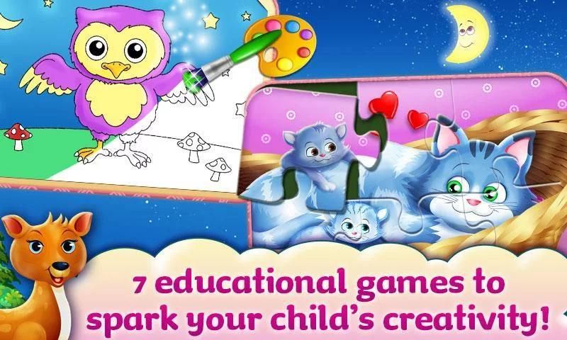 > 7 मजेदार और पेंट, पहेलियाँ, यह मैच पशु ठोकर, गिनती, भूलभुलैया और लुका छिपी सहित शैक्षिक मिनी खेल।