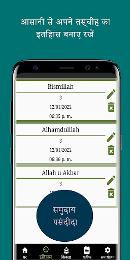 • उपयोगकर्ता दिनांक और समय के साथ इतिहास अनुभाग में सहेजने के लिए स्क्रीन पर ऊपरी दाएं कोने पर सहेजें बटन दबाकर वर्तमान तस्बीह के लिए मैन्युअल रूप से तस्बीह गणना मान को सहेज सकता है।