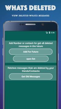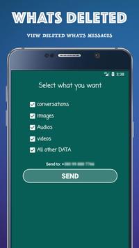 View and recovery Deleted WhatsApp Messages for FREE is new app for Detect and save deleted messages WhatsApp online files. Install WhatsDeleted database recovery, then track WhatsApp and select what content you want to save and you will not miss anything. Removed Whats detects when someone deletes a message from WatsApp, an image or any other file and saves them. With WhatsDeleted we take care to show you what your contacts do not want you to see. Do not let anyone delete a WatsAp message without you noticing with WhatsDeleted.