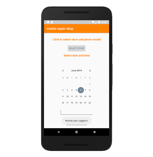 मोबाइल रिपेयर शॉप ऐप चयनित स्टोर पर एक फोन की मरम्मत बुक करने और किसी दिनांक और समय का चयन करने के लिए