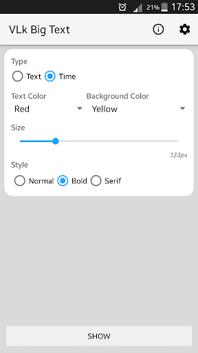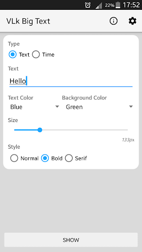फुलस्क्रीन में पाठ या समय प्रदर्शन विशेषताएं: • पाठ का आकार बदलें • पाठ और पृष्ठभूमि के रंगों का चयन करें : https://vlkapps.ru