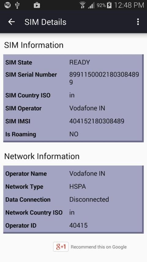 सिम विवरण: ऑपरेटर नाम, सिम स्थिति, सिम IMSI, रोमिंग सूचना, मोबाइल डेटा स्थिति, देश आईएसओ।