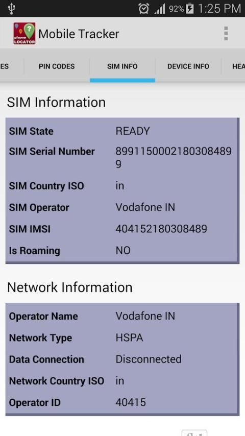 सिम विवरण: ऑपरेटर नाम, सिम स्थिति, सिम IMSI, रोमिंग सूचना, मोबाइल डेटा स्थिति, देश आईएसओ।