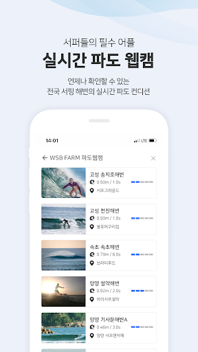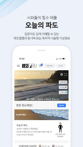 Pantai selancar utama Korea Keadaan selalu kelihatan dalam masa nyata , dan bahkan pemula dapat memahami maklumat cuaca laut dengan mudah. Dan anda boleh menikmati pelbagai kandungan yang menyeronokkan dari pelajaran melayari hingga hiburan. Nikmati gaya hidup berselancar yang lebih mudah dan pelbagai dengan W.SB Farm.