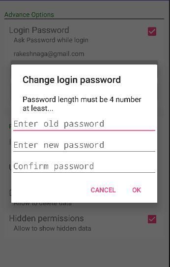 While login password checked will ask password on login time. If you will unchecked the will not ask password on login time. You can change your email id on click change email id button then enter a valid email id to change. Also you can change your login password on click change password button then enter new login password the password length must be 4 numbers at least. On checked insert permission check box you con insert data. If on unchecked insert permission you can not enter new data. On checked delete permission check box you can delete data. If on unchecked delete permission you can not delete data. On checked update permission check box you can update data. If on unchecked update permission you can not update data.
