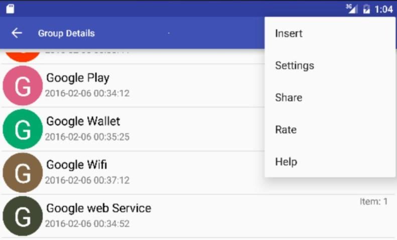 On click title item will show the details that has been stored by you. On Item long click will show delete option to delete the item from group.