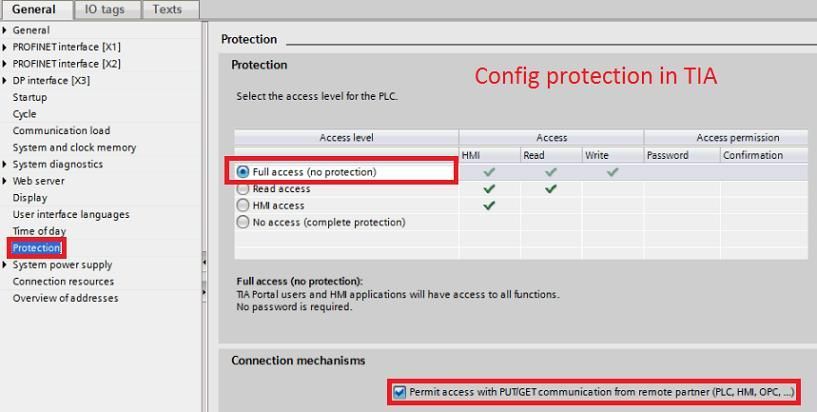 Siemens S7 – 1200, 300, 400. To ensure the correct functionalities of S7 -1200, the standard DB – compatible with S7 – 300/400 has to be used. Not optimized DB! Please set Protection properties to Full access and set Permit access with PUT/GET communication from remote partner.
