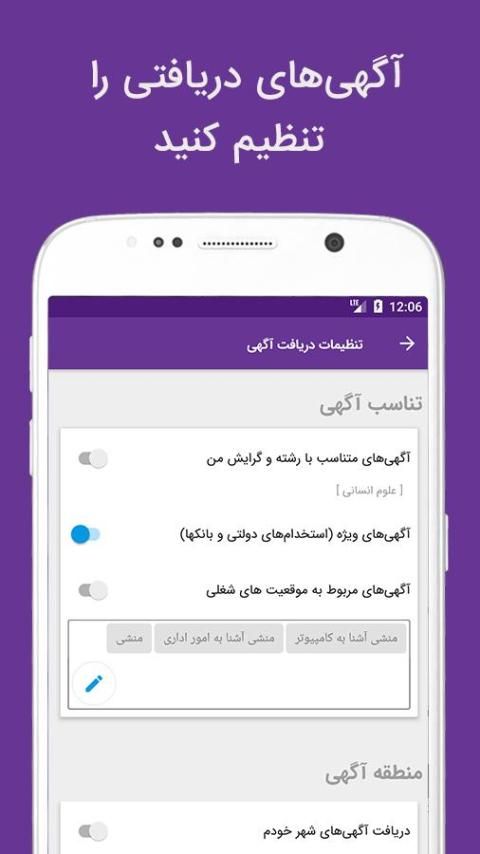• اعلان مشاغل، کارها و آگهی های مرتبط با « رشته تحصیلی » شما بصورت نوتیفیکیشن