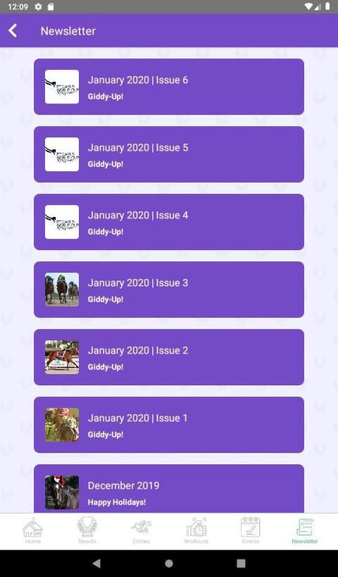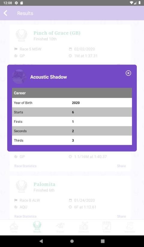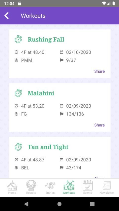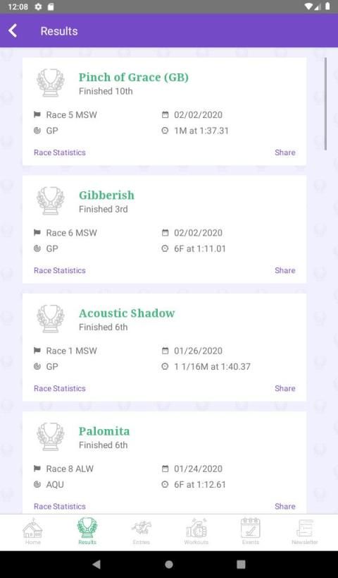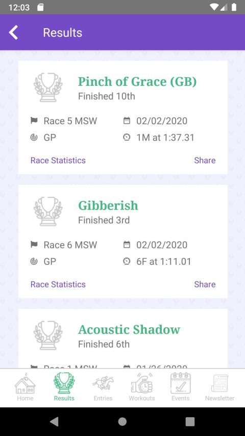 घोड़े द्वारा रेस प्रविष्टियों और परिणामों की पूरी सूची, साथ ही साथ वर्कआउट भी।