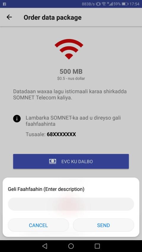 eData allows you to top-up mobile data for SOMNET Telecom in Somalia users. You can pay with EVC or Zaad service to pay for data packages.
