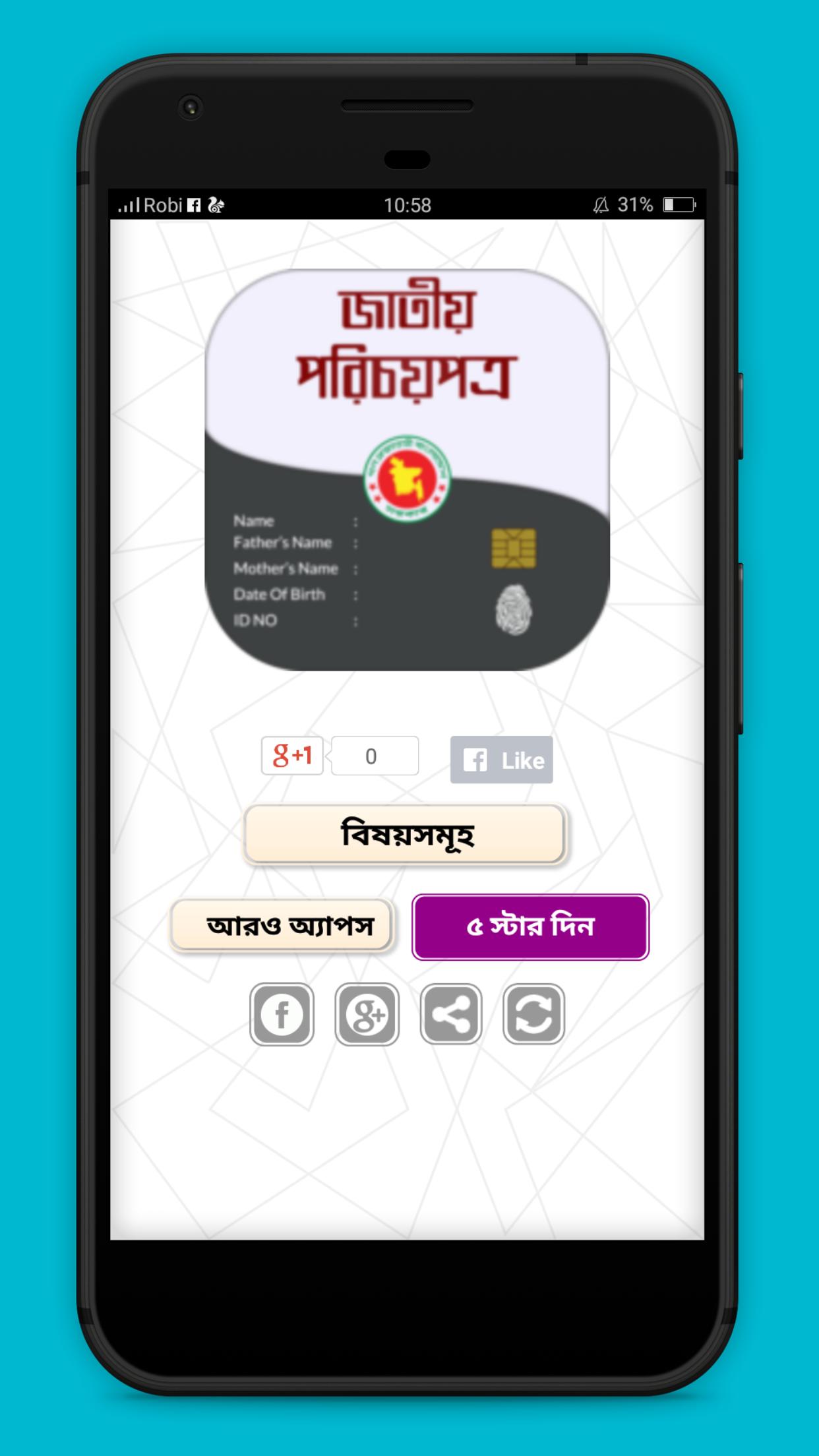 Throughout this app we have tried to discuss about Bangladesh National ID, BD Smart Card Finder, National id card bangladesh , NID Verification, Identicheck - ID card check etc. Smart Card is our latest version of National ID which has been started provided by the Govt. By this smart card many latest features have been added to get all national facilities provided by Govt. This national id card is one’s identity. Hope we have given proper information regarding this in our apps. Our approach will be successful if we can help everyone by giving proper information.