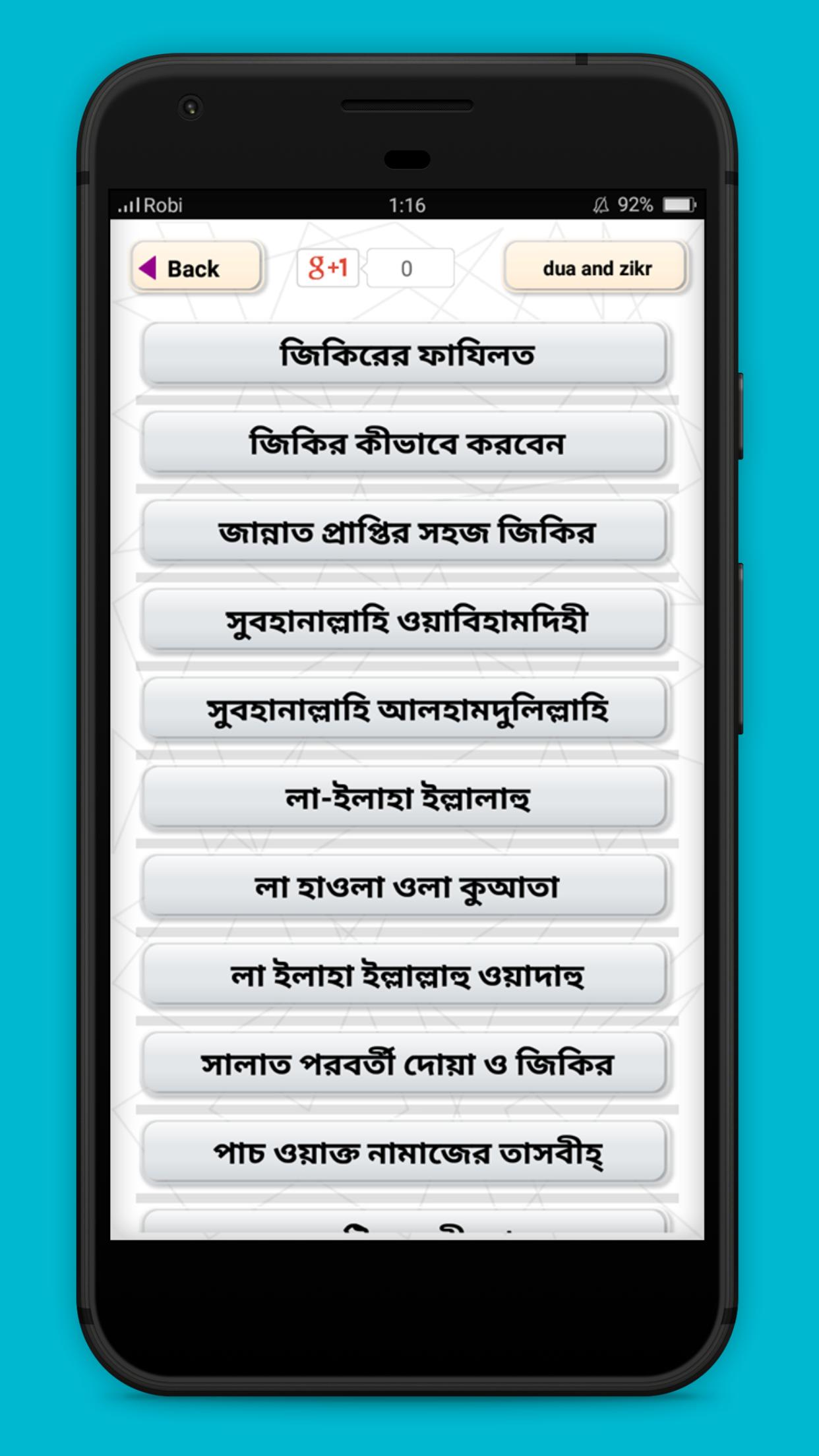 This app is mainly based on Dua and dhikr. For each and every muslim all over the world it is mandatory to do. So in order get inner peace and satisfaction Dhikr is very much needed. Dhikr must not only be felt by heart and uttered with the tongue but must also effect good deeds. So in this app we have discussed and given some most used and effective Dua and dhikr in bangla.Hope that this Islamic app will help you learn all duas perfectly.