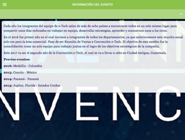 15 जुलाई - डिजिटल अभिनव सम्मेलन 2017 के अनुप्रयोग एंटीगुआ (ग्वाटेमाला) 11 में आयोजित किया जाएगा। यह ई-टेक टीम से संबंधित सम्मेलन के दौरान जानकारी और कार्यक्रम से परामर्श कर सकते हैं सभी उपस्थित। प्रस्तुतियों और गतिविधियों वे सम्मेलन के दौरान जगह लेने की जाएगी में सभी जानकारी के साथ वास्तविक समय में सूचनाएं प्राप्त करने के अलावा।