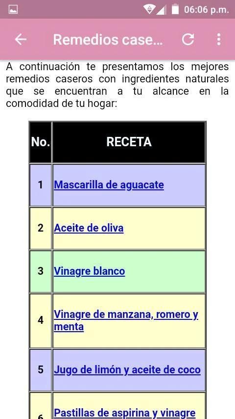 Algunas de las recetas para quitar la caspa son: Mascarilla de aguacate, vinagra blanco, romero, pastillas de aspirina, aloe vera o sábila, bicarbonato de sodio, enjuague bucal, etc.