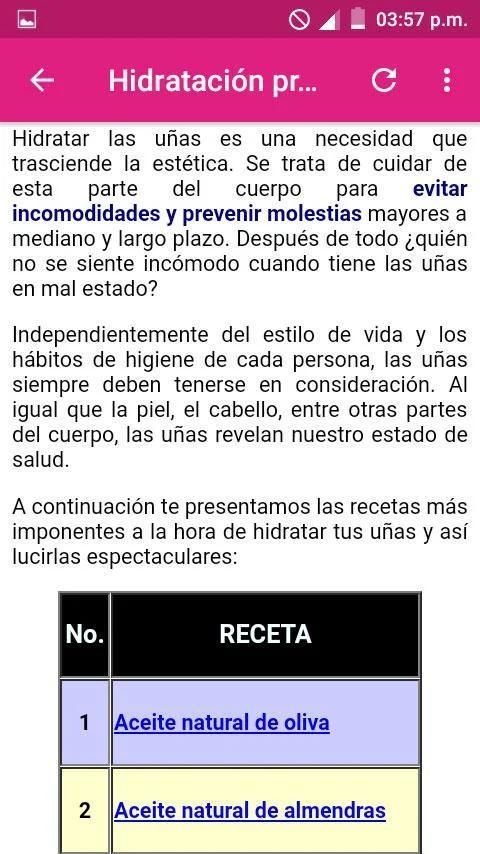 En esta app encontrarás los mejores trucos de belleza para tus manos y conocerás todos los temas relacionados con las uñas de pies y manos ya que es bien sabido que tener las uñas largas y saludables, es el deseo de muchas mujeres, sin embargo, esto no siempre es fácil de conseguirlo. Y es que a veces debido a hábitos nocivos, una mala alimentación, el tipo de trabajo o el uso excesivo de esmaltes o productos de mala calidad, mantener las uñas saludables y bonitas puede convertirse realmente en una tarea difícil. Para conseguirlo y lucir una manicura (manicure) o pedicura (pedicure) siempre impecable, además de poner solución a todos los malos hábitos que influyan en la imagen de las uñas, es posible recurrir a algunos productos naturales muy efectivos con propiedades regeneradoras e hidratantes, los mismos que los encuentras con facilidad en tu hogar.