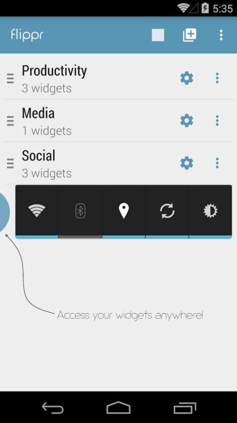 आप इस छोटे बुलबुले के साथ अपने सभी विगेट्स उपयोग कर सकते हैं - Flippr आप सभी क्षुधा के शीर्ष पर रहता है जो साथ बातचीत कर सकते हैं कि एक छोटा बुलबुला है. बुलबुला टच और चिकनी संक्रमण में विगेट्स स्विच करने के लिए क्षैतिज उंगली चाल है. समूह (सामाजिक, मीडिया, नोट्स) में अपने विगेट्स व्यवस्थित करें. टच और समूहों स्विच करने के लिए खड़ी उंगली चाल है.