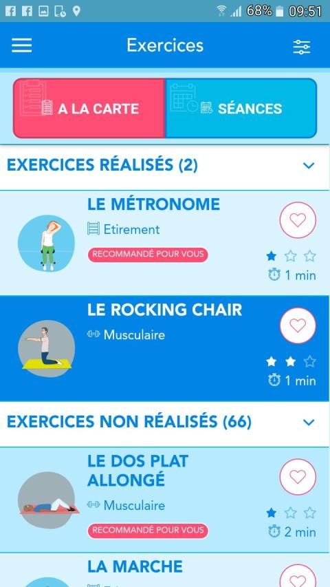 वीडियो के रूप में आपकी पीठ के लिए फायदेमंद व्यायामों की खोज करें, दोनों को अलग-अलग "आ ला कार्टे" और कई अभ्यासों से मिलकर "सत्र" के रूप में प्रस्तावित किया। आप अपनी खुद की कसरत भी कर सकते हैं। आप को बनाए रखने में मदद करने के लिए अनुस्मारक अनुसूची। 3 मानदंडों के अनुसार अपने व्यायाम या अपने सत्रों को क्रमबद्ध करें: कठिनाई का स्तर (1 से 3 स्टार), व्यायाम का प्रकार (स्ट्रेचिंग, मांसपेशियों, विश्राम), काम पर व्यायाम योग्य व्यायाम।