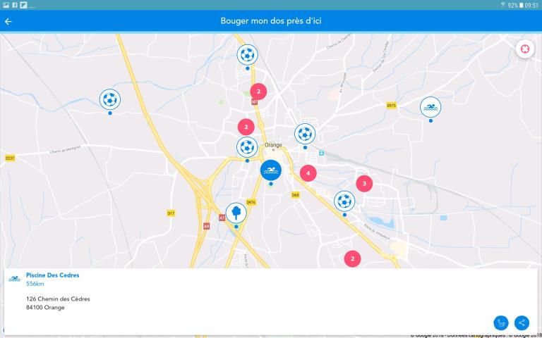 Avec ou sans géolocalisation activée, trouvez les équipements sportifs près de vos lieux habituels (travail, domicile…) pour faire bouger votre dos : parcs, stades, terrains de sports, piscines, à l’extérieur ou en intérieur… Et partagez ces adresses avec vos amis pour préserver ensemble la santé de votre dos.