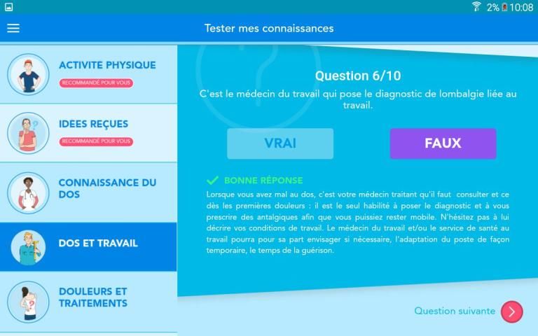 Quatre questions permettent de personnaliser l’appli Activ’Dos : les exercices et les séances qui correspondent le mieux à votre situation vous sont proposés en priorité.