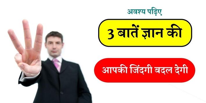 ये 3 बातें अवश्य पढ़िए जो आपकी जिंदगी बदल सकती है। रुको! आप सफल बनना चाहते हो सिर्फ इस वजह से आपके जीवन में कभी सफलता नही आएँगी। जब कभी भी आप अपने आस-पास सफल लोगो को देखते हो, तब ये बात कभी नही भूले की वे भी अपने आप को इन्ही ज्ञान की बातो को मानते है। सफलता के रास्तो में उन्होंने कई बार असफलता भी देखी है। सफल इंसान सफलता पाने के लिए अपनी कई आदतों का त्याग भी करता है और कई नयी आदतों को अपनाता भी है। यदि आप सफलता प्राप्त करने के लिए गंभीर हो, तो आपको अपने अंदर के साधारण इंसान को कुछ नया पाने के लिए छोड़ना होंगा, इसी तरह आपमें बदलाव आ सकते है। ये ज्ञान की बाते को जाने बिना नए दिन की शुरुवात करने के लिये एक कदम भी आगे मत बढाइये। यह ज्ञान की बाते आपमें अपार उर्जा का निर्माण करेंगी, इसीलिये अपना पुरा ध्यान इस लेख पर दीजिये! जब आप इन ज्ञान की बातो को अपनाओगे, तो आपको सफल बनने से कोई नही रोक सकता। अगर आपको यह ऍप पसंद आये तो रेटिंग जरूर करें तथा ऍप को और अधिक उपयोगी बनाने के लिए आपके सुझाव सादर आमंत्रित है।
