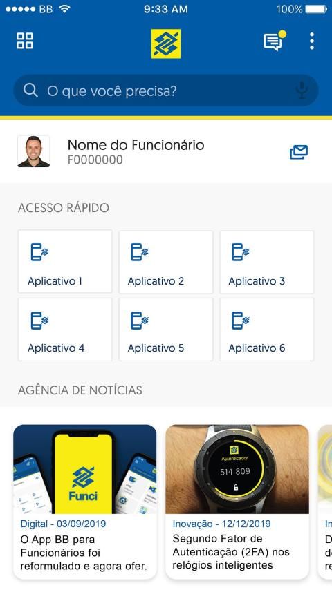 O BB para Funcionários é um super app corporativo que traz agilidade ao dia a dia de gerentes e especialistas em negócios. Com ele, o funcionário ganha liberdade para visitar e atender o cliente como dono. Algumas funcionalidades podem ser sincronizadas com o WearOS.
