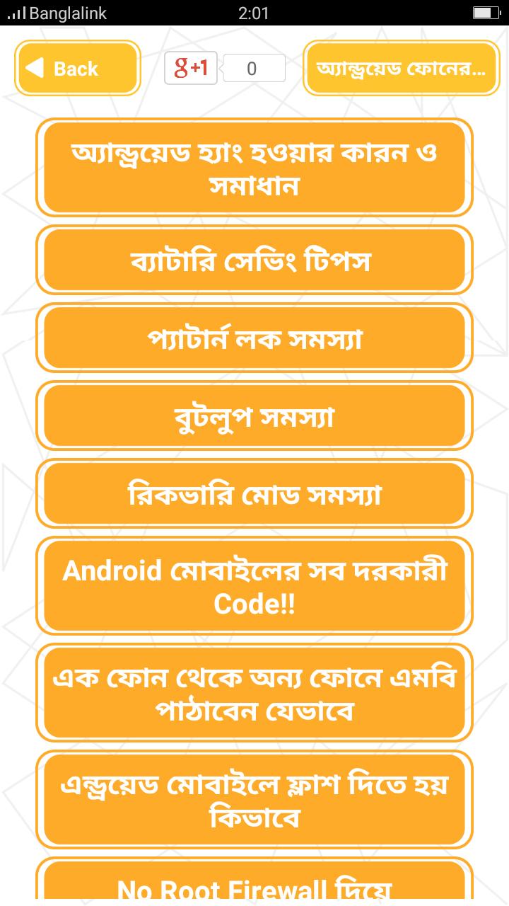 Mobile phone tips bangla is an android tips solution app . There is an aramus number of android users in Bangladesh. While we use smartphone very often we face lots of problem with our device. Sometimes we face problem with pattern lock , sometimes heating and battery charging problem , Ram problem, SD card problem, struggling with emergency short code of mobile network service