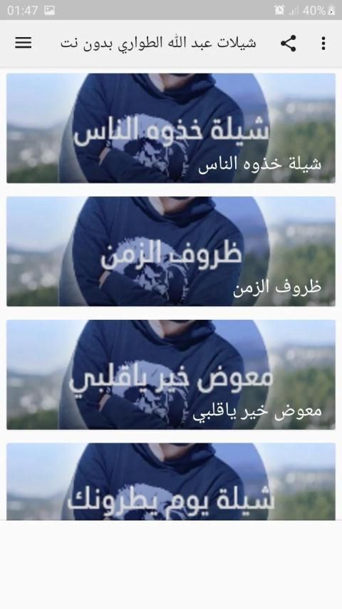 إذا كنت من معجبين باغاني عبد الله الطواري بدون أنترنيت و تبحث عن تطبيق يحتوي على عبد الله الطواري الحصرية فهذا التطبيق يناسبك.