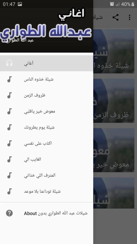 يحتوي التطبيق على الأغاني الشهيرة للفنان عبد الله الطواري.