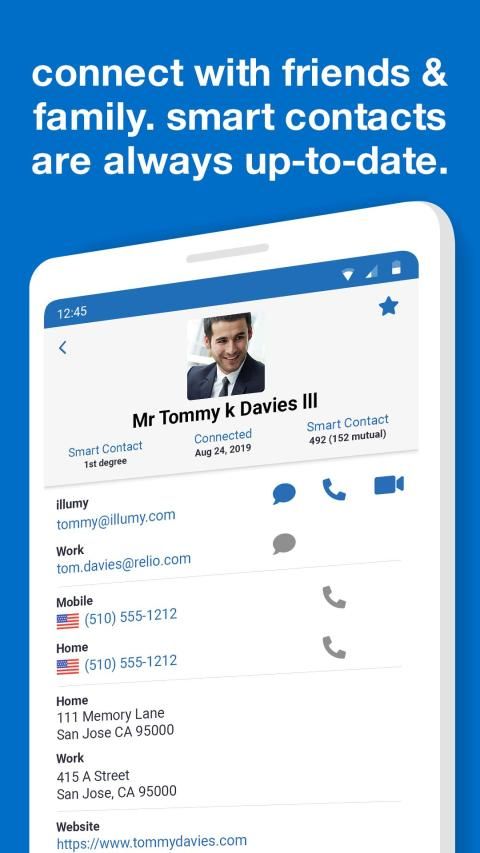 SMART CONTACTS: Next-gen contact management allows you to import your contacts into illumy and transform those basic contacts into smart contacts that are always up to date. No more wondering if you have the right number or email for your contacts. You can also connect with others, sync contacts, and share your profile with them—and you can decide who can see which piece of your contact info.