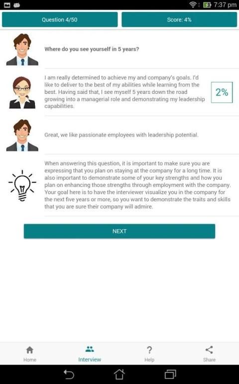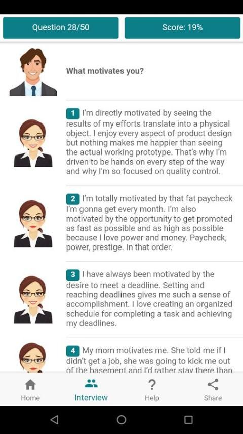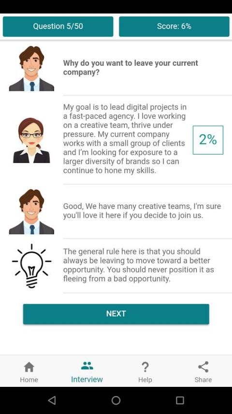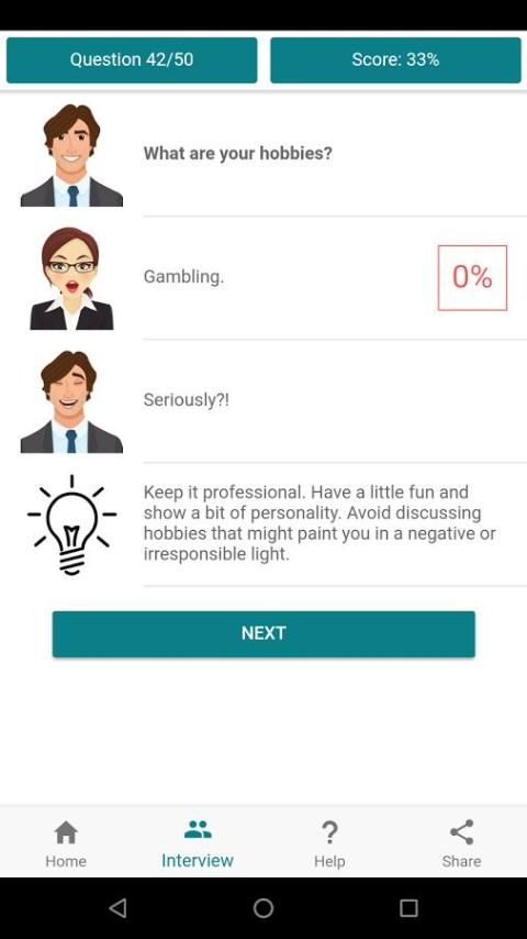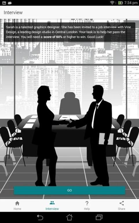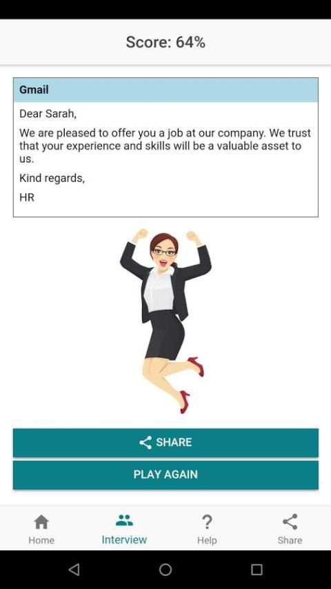 सबसे मजेदार तरीके से एक नौकरी के साक्षात्कार के लिए अभ्यास करने के लिए। सारा (खेल के मुख्य चरित्र) मदद उसे साक्षात्कार पास और 50 सबसे आम साक्षात्कार सवाल का जवाब देने का तरीका सीखें। खेल साक्षात्कारकर्ता और उम्मीदवार के बीच एक इंटरैक्टिव बातचीत है। प्रत्येक प्रश्न एक बहु विकल्प प्रारूप जहां आप सही उत्तर का चयन करें और अंक अर्जित करने का उपयोग कर सकते में प्रस्तुत किया है। साक्षात्कारकर्ता से त्वरित प्रतिक्रिया, और प्रत्येक सवाल का जवाब देने के बाद महान सुझाव प्राप्त करें। खेल के अंत में, आप पास या अपने स्कोर के आधार पर साक्षात्कार असफल हो जायेगी।