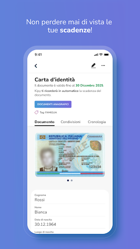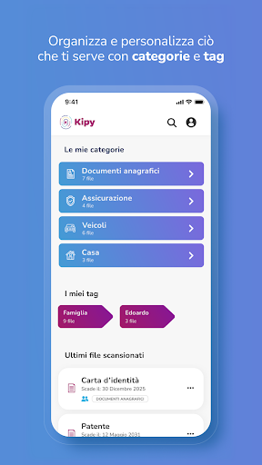 Kipy एक डिजिटल पोर्टफोलियो है जहाँ मैं अपने सभी कार्ड और दस्तावेज (जैसे पासपोर्ट या हेल्थ कार्ड) रख सकता हूं और सभी समय सीमाओं को एक साधारण तरीके से ऑर्डर करके उन्हें सुरक्षित रूप से स्कैन कर सकता हूं। दैनिक नौकरशाही के प्रबंधन में आपका जीवन आपके लिए है ताकि आपके पास जो आप प्यार करते हैं उसे समर्पित करने के लिए अधिक समय हो सकता है। आप क्लाउड के क्लाउड में अपलोड करना चाहते हैं; ऐप;हमारा स्कैन सिस्टम एक स्कैनर की तुलना में बहुत बेहतर काम करता है: यह स्वचालित रूप से छवि, किनारों का पता लगाता है और इसकी गुणवत्ता का अनुकूलन करता है।