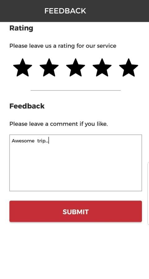- सवारी के बाद, आप अपनी सवारी को रेट कर सकते हैं और हमें अनुभव को बेहतर बनाने में मदद करने के लिए प्रतिक्रिया प्रदान कर सकते हैं। आपको ईमेल द्वारा एक रसीद भी मिलेगी।