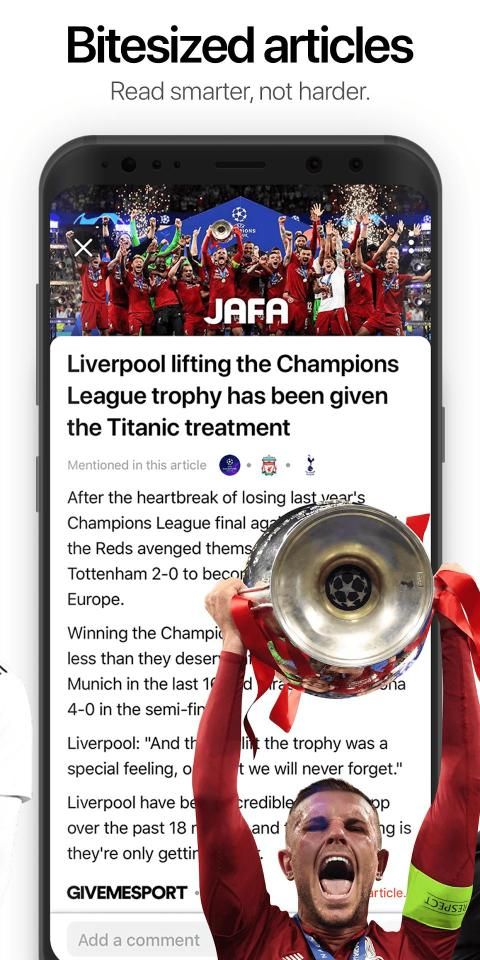 With JAFA, only see the content that interests you! It’s all personalised to you, simply set your preferences and we do the rest. With full support for Premier League, UK, European and global soccer, you’re sorted - whether you’re eager for La Liga, obsessed with Arsenal, or you’re mad for Man City!