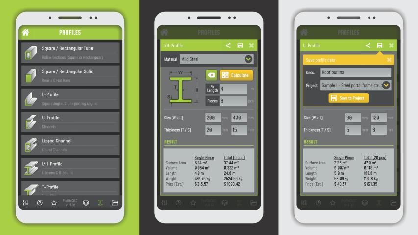 ProfileCALC एक पेशेवर, उपयोग में आसान प्रोफ़ाइल वजन, सतह क्षेत्र और लागत आकलन प्रणाली है इंजीनियरों, ठेकेदारों, संरचना डिजाइनरों, मात्रा सर्वेक्षणकर्ताओं द्वारा उपयोग के लिए डिज़ाइन किया गया है। एप्लिकेशन आपको जल्दी से स्टील या लकड़ी के फ्रेम संरचनाओं के लिए अनुमान, गणना और रिपोर्ट बनाने की अनुमति देता है। इसका उपयोग छत के ट्रस, पोर्टल फ्रेम, कॉलम, बीम, गेट्स, बाड़, कारपोर्ट, बालुस्ट्रैड और बहुत कुछ के लिए सामग्रियों की गणना करने के लिए किया जा सकता है!